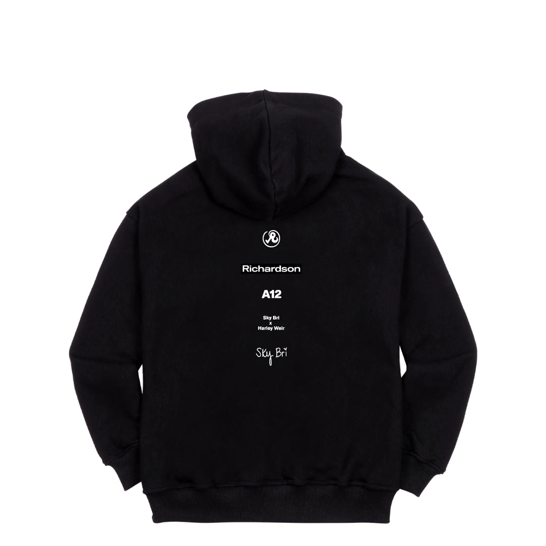 100% cotton fleece drop-shoulder hooded sweatshirt with a hybrid of direct-to-garment and plastisol screen-printed 'A12' graphics on front and back, kangaroo pocket with R Glyph tab, and no drawstrings.