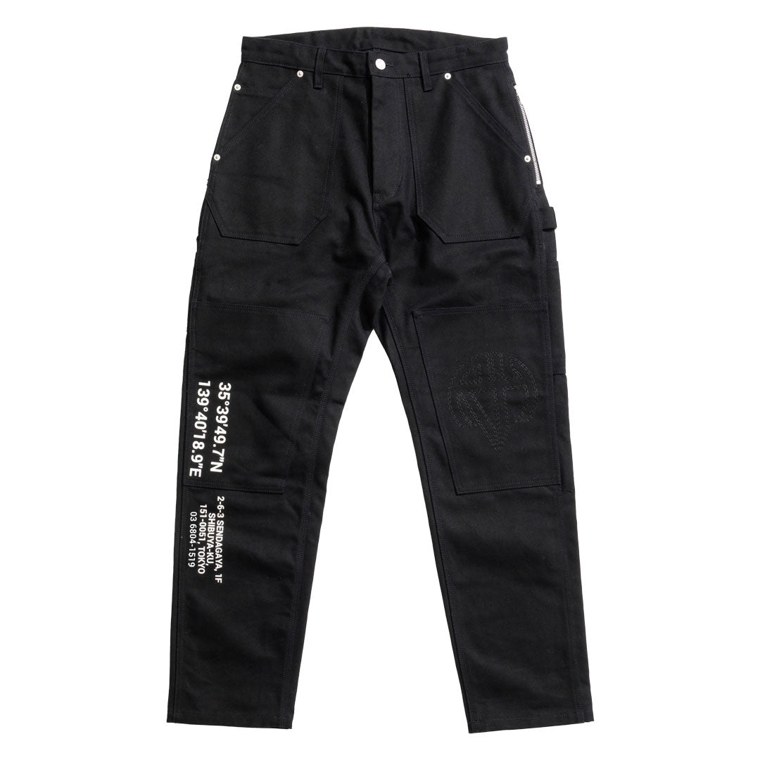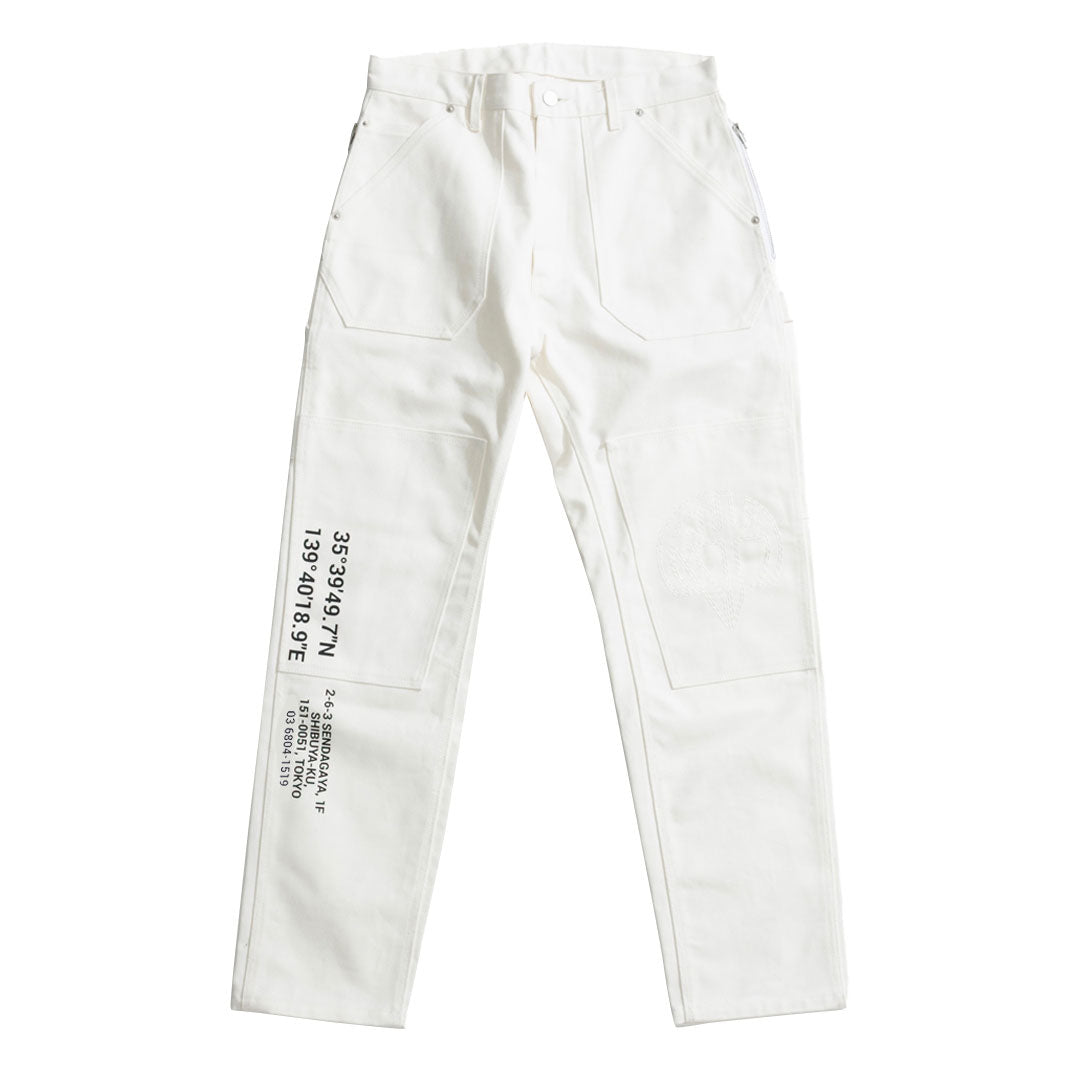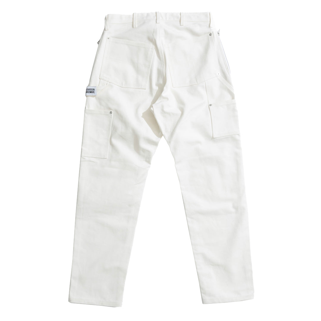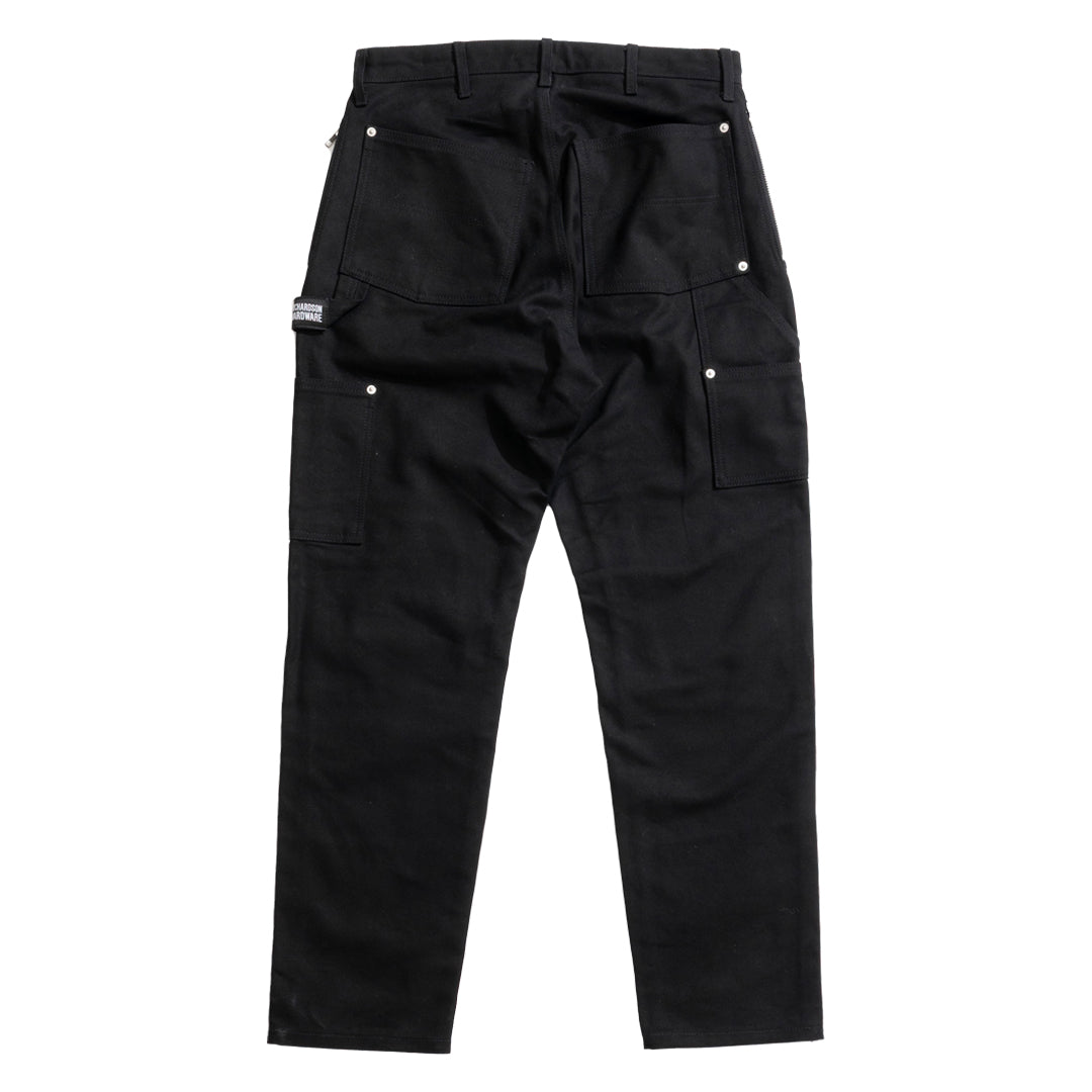 100% cotton 13oz duck canvas with reinforced knee panels, hammer loop with Richardson Hardware label, YKK side zip stash pockets, riveting, custom shank buttons, tonal double stitched RH logo on left leg, and Under R's Tokyo address screen-printed on right leg.
