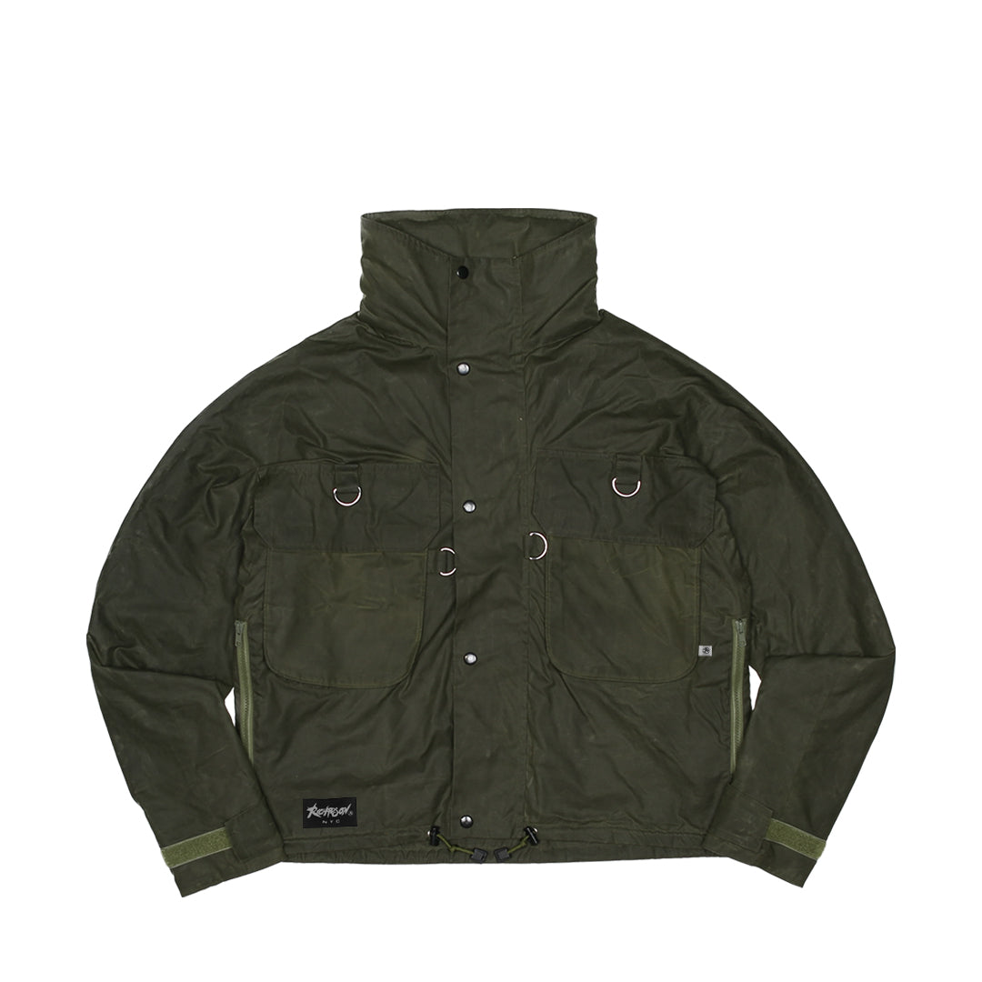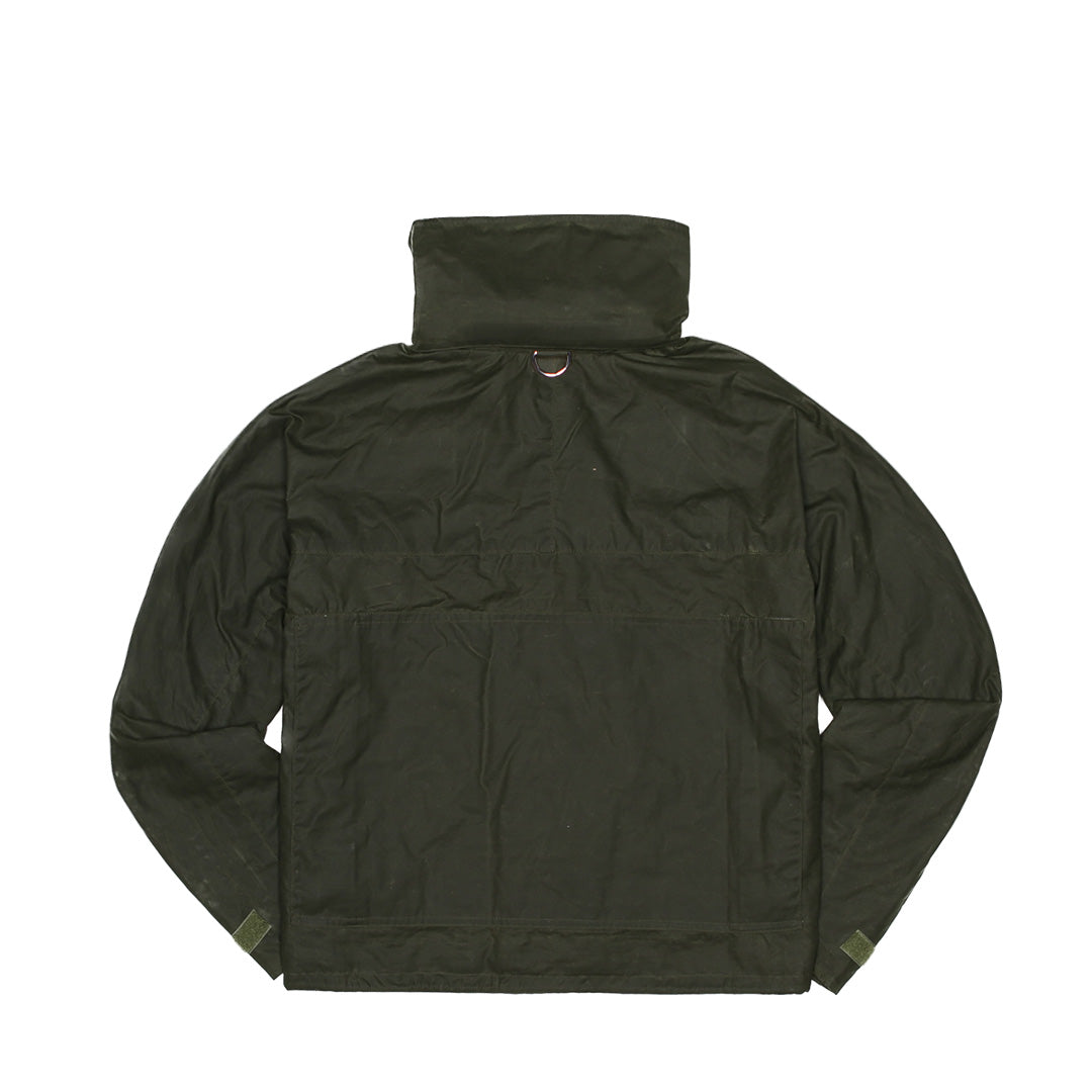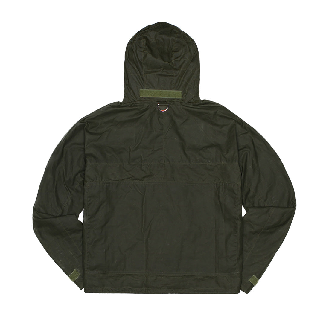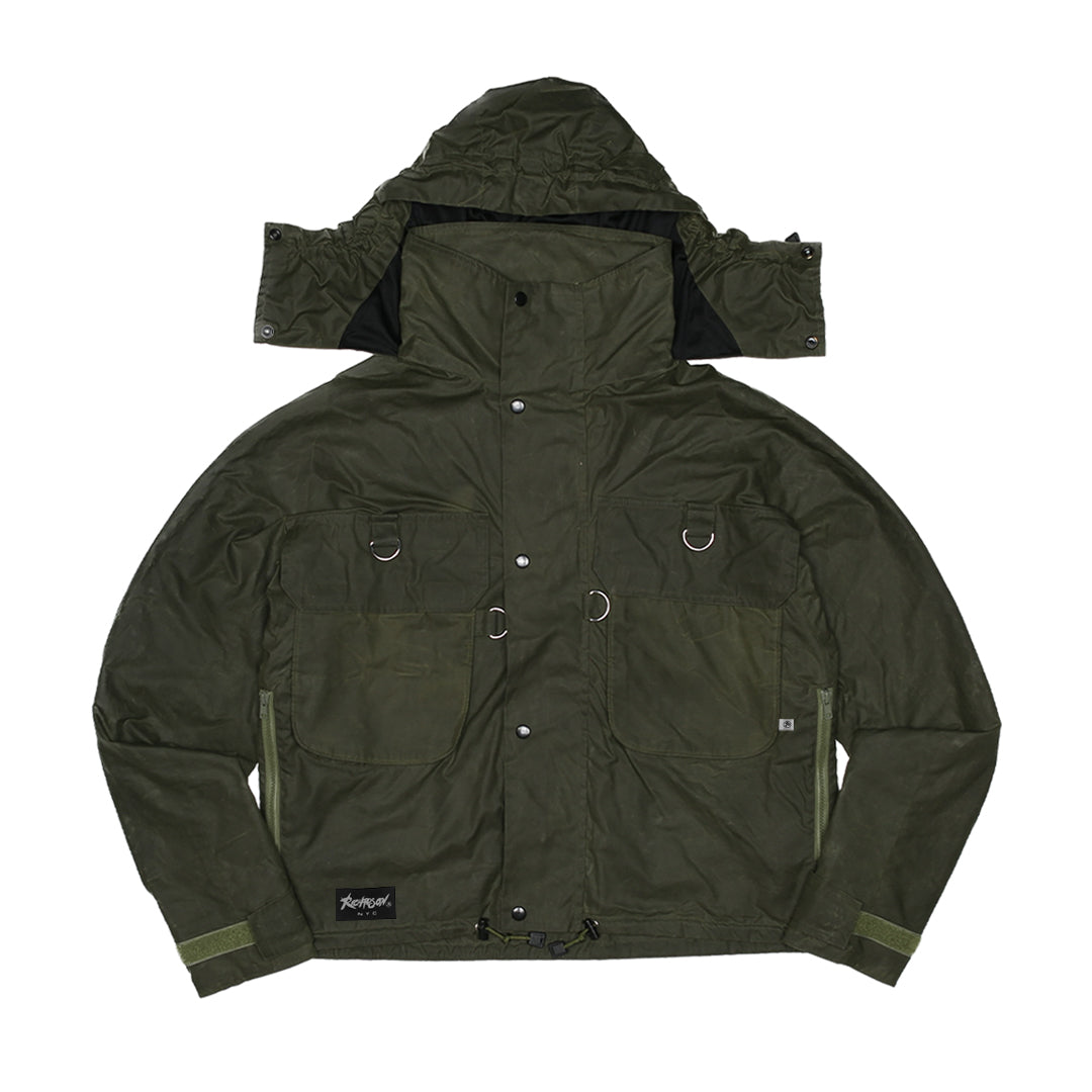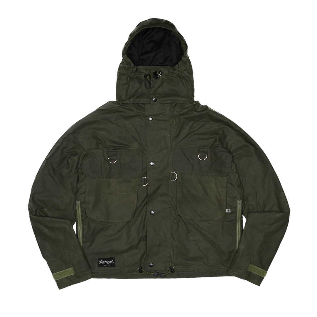 100% waxed cotton cropped parka with two front patch pockets, a packable hood, stainless steel D-rings, elastic drawstrings, velcro fastening, nylon mesh lining, and tearable Tyvek® label.